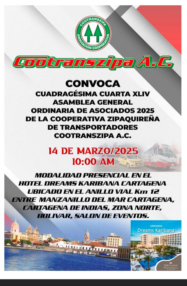 La Cooperativa Zipaquireña de Transportadores, Cootranszipa A.C., ha anunciado oficialmente la convocatoria a su Cuadragésima Cuarta (XLIV) Asamblea General Ordinaria de Asociados 2025. Este evento crucial para la organización se llevará a cabo el próximo 14 de marzo de 2025, a partir de las 10:00 AM, en la ciudad de Cartagena de Indias, Colombia.